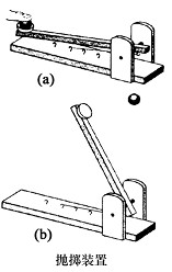 圖所示的是一個拋擲乒乓球的裝置。橡皮筋的一端固定在可轉動的木片的一端,另一端可掛在底座上不同位置的掛鉤上,用手向下壓木片,將乒乓球置于半球形容器里,放手后乒乓球即可拋擲出去了。那么乒乓球被該裝置拋擲出去的遠近與那些因素有關呢?