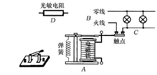 電磁繼電器在各種自動化裝置中有很多應用,街道路燈自動控制就是其應用之一。如圖所示為模擬電路,其中A為電磁繼電器,B為照明電路,C為路燈,D為光敏電阻(白天光照強時,電阻變小,電磁鐵磁性較強;夜晚光照弱時,電阻變得很大,電磁鐵幾乎無磁性),請你電路連接完整,達到白天燈熄、夜晚燈亮的效果。(連線時導線不能交叉)