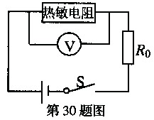 用這種材料制成的熱敏電阻與電壓表等元件連成如圖電路。電源電壓為V伏,電壓表量程為0~3V,R0阻值為500Ω。若把電壓表的刻度盤改為指示水溫的刻度盤,則下列說法正確的是: