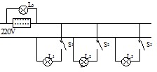 一條剛裝好的民用照明電路(如圖),在未裝保險絲之前,先將規(guī)格為“220V40W”的白熾燈L0接在火線上要裝保險絲的兩個接線柱上,當(dāng)只閉合S1時,L0和L1都呈暗紅色;當(dāng)只閉合S2時,L0正常發(fā)光;當(dāng)只閉合S3時,L0不亮。下列判斷正確的是: