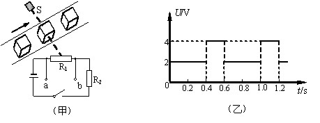 如圖(甲)所示是某生產(chǎn)流水線上的產(chǎn)品輸送及計(jì)數(shù)裝置示意圖。其中S為一激光源,R1為光敏電阻(有光照射時(shí),阻值較小;無光照射時(shí),阻值較大),R2為定值保護(hù)電阻,a、b間接一“示波器”(示波器的接入不影響電路)。光敏電阻兩端的電壓隨時(shí)間變化的圖象,可由示波器顯示出來。水平傳送帶勻速前進(jìn),每當(dāng)產(chǎn)品從傳送帶上通過S與R1之間時(shí),射向光敏電阻的光線會(huì)被產(chǎn)品擋住。若運(yùn)送邊長(zhǎng)為0.1m,質(zhì)量為0.6kg的均勻正方體產(chǎn)品時(shí),示波器顯示的電壓隨時(shí)間變化的圖象如圖(乙)所示。請(qǐng)回答下列問題: