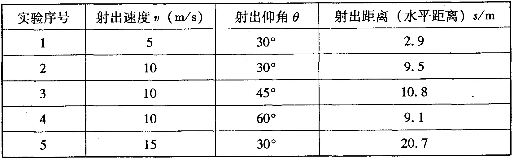 李紅說:“我們還是通過實(shí)驗(yàn)來探究吧”,于是,他們制作了一個(gè)小球彈射器(圖15所示),它能使小球以不同速度大小和方向射出,彈射方向與水平的仰角,可由固定在鐵架臺上的量角器讀出,他們通過 5 次實(shí)驗(yàn)得到下表中的數(shù)據(jù):