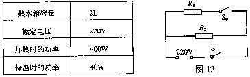 (08菏澤)(6分)電熱飲水機有加熱和保溫兩種工作狀態(tài)(由機內(nèi)溫控開關(guān)Se自動控制),從說明書上收集到如下數(shù)據(jù)及圖12所示的電路原理圖
