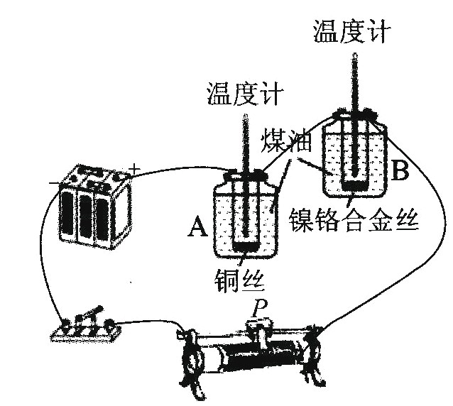 小明和小紅想利用如圖所示的裝置探究“導(dǎo)體產(chǎn)生的熱量與電阻大小的關(guān)系”。兩瓶煤油中都浸泡著一段金屬絲,燒瓶A中的金屬絲是銅絲,電阻比較小,燒瓶B中的金屬絲是鎳鉻合金絲,電阻比較大。溫度計顯示煤油的溫度。