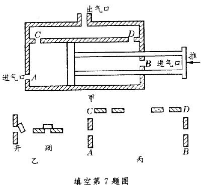 為農(nóng)戶用的一種風(fēng)箱的結(jié)構(gòu)示意圖,其中在A、B、C、D四處分別裝有單向通風(fēng)閥門,使得無論向左推或向右推活塞時(shí),風(fēng)箱都能向灶中送風(fēng)。若此時(shí)正向左推活塞,請(qǐng)?jiān)诒麍D中畫出這時(shí)閥門的開、閉狀態(tài)。作圖時(shí)可參照?qǐng)D乙的畫法。