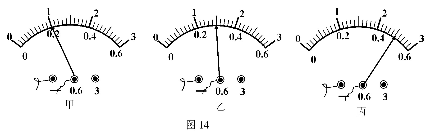 (2)在改正錯誤后,把電流表分別放在a、b、c三處測電流,其讀數(shù)分別如圖14甲、乙、丙所示,請你幫小強設計一個記錄實驗數(shù)據(jù)的表格(在方框圖上畫),并將數(shù)據(jù)填入你設計的表格中.