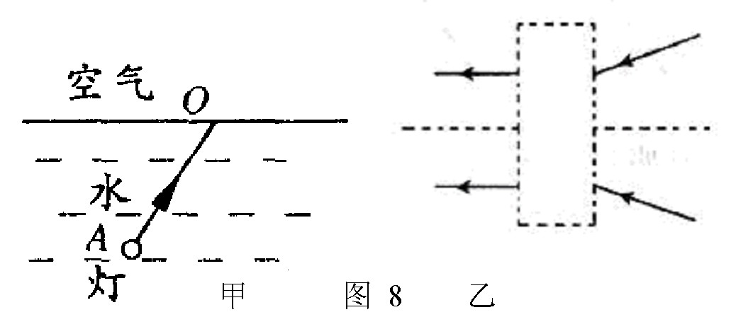 (1)水中有一盞燈,它發(fā)出的光在進(jìn)入空氣時(shí)發(fā)生了折射.請(qǐng)?jiān)趫D8甲中大致畫(huà)出其中一束光線AO的折射光線。