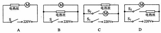 家用電吹風(fēng)由電動(dòng)機(jī)和電熱絲等組成.為了保證電吹風(fēng)的安全使用,要求:電動(dòng)機(jī)不工作時(shí),電熱絲不能發(fā)熱:電熱絲不發(fā)熱時(shí),電動(dòng)機(jī)仍能工作.下列電路中符合要求的是