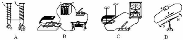 電動(dòng)機(jī)是一種高效率、低污染的動(dòng)力設(shè)備。下圖所示的四幅實(shí)驗(yàn)裝置圖中,對(duì)電動(dòng)機(jī)的發(fā)明有直接影響的是