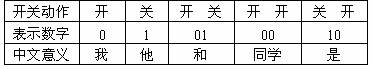數(shù)字通信是一種既現(xiàn)代又古老的通信方式,F(xiàn)代電話已全部采用數(shù)字信號(hào)進(jìn)行處理。若用“0”和“1”代表“開”和“關(guān)”這兩個(gè)動(dòng)作,組成一組數(shù)字信號(hào),可以表達(dá)一句話。例如: