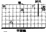 舞蹈教室有一面非常大的平面鏡,如圖所示,甲、乙、丙、丁四位學(xué)生在教室內(nèi)排練舞蹈,當(dāng)老師從外面進(jìn)入到圖示位置時,他能從平面鏡中觀察到的學(xué)生是