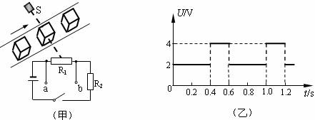如圖(甲)所示是某生產(chǎn)流水線上的產(chǎn)品輸送及計(jì)數(shù)裝置示意圖。其中S為一激光源,R1為光敏電阻(有光照射時(shí),阻值較。粺o(wú)光照射時(shí),阻值較大),R2為定值保護(hù)電阻,a、b間接一“示波器”(示波器的接入不影響電路)。光敏電阻兩端的電壓隨時(shí)間變化的圖象,可由示波器顯示出來(lái)。水平傳送帶勻速前進(jìn),每當(dāng)產(chǎn)品從傳送帶上通過(guò)S與R1之間時(shí),射向光敏電阻的光線會(huì)被產(chǎn)品擋住。若運(yùn)送邊長(zhǎng)為0.1m,質(zhì)量為0.6kg的均勻正方體產(chǎn)品時(shí),示波器顯示的電壓隨時(shí)間變化的圖象如圖(乙)所示。請(qǐng)回答下列問(wèn)題: