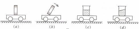 如圖(a) 所示,木塊與小車一起做勻速直線運動,當小車的運動狀態(tài)發(fā)生變化時,木塊的狀態(tài)如圖(b) 所示。把木塊換成盛有水的燒杯,重復上述過程,燒杯中水面的狀態(tài)分別如圖(c) 和 (d) 所示。