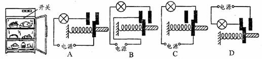 如圖所示,電冰箱內有一個通過冰箱門來控制的開關,當冰箱門打開時,開關閉合使冰箱內的照明燈點亮;當冰箱門關閉時,開關斷開使冰箱內的照明燈熄滅。如圖所示的四個電路中,能正確表示冰箱開門狀態(tài)下冰箱內照明電路的是