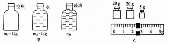 小剛同學(xué)想測醬油的密度,但家里只有天平、小空瓶,而沒有量筒。他思考后按照自己設(shè)計的實驗步驟進行了測量,測量內(nèi)容及結(jié)果如圖所示。