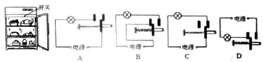 電冰箱內(nèi)有一個通過冰箱門來控制的開關(guān),當(dāng)冰箱門打開時,開關(guān)閉合使冰箱內(nèi)的照明燈點(diǎn)亮;當(dāng)冰箱門關(guān)閉時,開關(guān)斷開使冰箱內(nèi)的照明燈熄滅。在圖所示的四個電路中,能正確表示冰箱開門狀態(tài)下冰箱內(nèi)照明電路的是