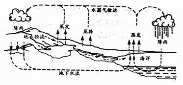 下圖是關于水循環(huán)的示意圖.地球上的水在不停地循環(huán)著.陽光曬暖了海洋,水變成水蒸氣升到空中,形成暖濕氣流.暖濕氣流遇到冷空氣后水蒸氣液化成小水滴,變成雨.天空的降水落到地面,一部分直接變成小溪,另一部分滲入地下,涌出地表后,變成股股清泉.許多小溪匯合,形成江河,又注入大海.