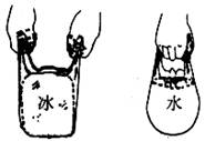 夏天,把一大塊冰放在塑料袋中,如下圖所示,過一段時(shí)間后,冰變成了水,這是 現(xiàn)象,塑料袋的冰變成水后,塑料袋向四周鼓起來,這是因?yàn)橐后w向各個(gè)方向都有 。