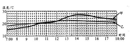 星期天,小明同學(xué)在父母的協(xié)助下,從早上七點(diǎn)開始每隔半小時(shí)對(duì)他家附近的氣溫和一個(gè)深水池里的水溫進(jìn)行測量,并根據(jù)記錄的數(shù)據(jù)繪成溫度―時(shí)間圖象,如圖所示。從圖線可以看出乙的溫度變化幅度小,是___ _(選填“氣溫”或“水溫”)的圖線,溫度變化幅度小的原因是 。