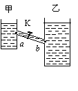 B.打開閥門K后,由于b處的壓強大于a處的壓強,水將從乙流到甲