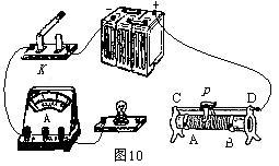 如圖10所示,有一根導(dǎo)線尚未連接,請用筆線代替導(dǎo)線補上,補上后要求,當(dāng)滑動變阻器的滑片P向左移動時,電流表的示數(shù)變大。