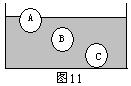 如圖11所示,體積相等的物體A、B、C浸入某種液體中,平衡后如圖所示,它們受到液體的浮力大小分別為FA、FB、FC ,則( 。