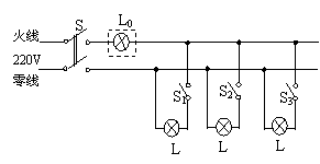 電工師傅常用一只標(biāo)有“220V 40W”的燈泡L0(檢驗(yàn)燈泡)取代保險(xiǎn)絲來(lái)檢查新安裝的照明電路中每個(gè)支路的情況,如圖所示。當(dāng)只閉合S、S1時(shí)L0不亮;當(dāng)只閉合S、S2時(shí),L0和L2都呈暗紅色;當(dāng)只閉合