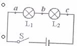如圖所示,閉合開(kāi)關(guān)S時(shí),燈泡L1、L2都不亮。用一段導(dǎo)線的兩端接觸a、b兩點(diǎn)時(shí),兩燈都不亮;接觸b、c兩點(diǎn)時(shí),兩燈都不亮;接觸C、d兩點(diǎn)時(shí),兩燈都亮。則[ ]