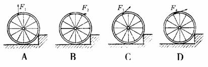 在海南舉辦的大力士比賽中,有一個(gè)項(xiàng)目是把車(chē)輪推上臺(tái)階。下面把車(chē)輪推上臺(tái)階的四種方法,推力的作用點(diǎn)相同,推力的方向不同,如圖所示,則哪一種推法最省力( 。
