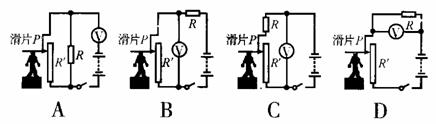 小明觀察了市場(chǎng)上自動(dòng)測(cè)高儀后,設(shè)計(jì)了以下四個(gè)電路(其中R’是滑動(dòng)變阻器,R是定值電阻,電源兩極間電壓恒定)。其中能實(shí)現(xiàn)身高越高,電壓表示數(shù)越大的電路是( 。