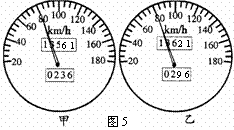善于觀察的小明,坐在勻速行駛在平直公路上的汽車中,看到汽車上有一個顯示速度和路程的表盤,示數如圖5甲所示,汽車以此速度勻速行駛了一段時間后,表盤示數變?yōu)閳D5乙所示,汽車勻速行駛的這段時間為 h。