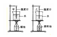 小明同學(xué)學(xué)習(xí)了燃料的熱值后,考慮到燃料燃燒放出的熱量會(huì)被水吸收,而水的比熱已知。(注:燃料完全燃燒放熱用Q放=mq計(jì)算,某燃料的熱值用q表示;其質(zhì)量用m表示)。自己設(shè)計(jì)一個(gè)實(shí)驗(yàn)來探究煤油和菜籽油的熱值的大小關(guān)系。他組裝了圖所示的裝置進(jìn)行實(shí)驗(yàn),記錄結(jié)果見下表: