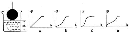 將一半徑為R的實心金屬球,用細(xì)線拉著,勻速緩慢地放入水深為2R的盛水容器中,直至容器底部,水未溢出。下圖能反映金屬球從水面剛接觸處開始至容器底部過程中,所受浮力的大小F與金屬球浸入水中深度h的關(guān)系的是( )