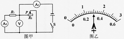 如圖甲所示電路中,電源電壓不變,閉合開關(guān)S,將滑片P移到某一位置時,電壓表示數(shù)為6V,兩塊電流表指針的位置均如圖乙所示,則R1電阻是________Ω,此時R2的電功率是________W;若將滑片P向右移動,A1的示數(shù)將________,A2的示數(shù)將________ (填“變大”、“變小”或“不變”).