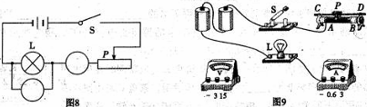 (3)按圖8連接好電路,閉合開關(guān)前,滑動變阻器的滑片P應(yīng)調(diào)至_________端(選填“A”或“B”);閉合開關(guān)后,發(fā)現(xiàn)燈泡不發(fā)光,電流表無示數(shù),但電壓表示數(shù)接近電源電壓,則產(chǎn)生此故障的原因可能是____________________________。