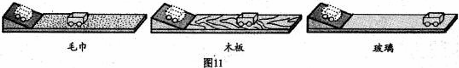 在探究“力對物體運動的影響”的實驗中,在水平桌面上分別鋪上分別粗糙程度不同的毛巾、棉布、玻璃,讓小車自斜面頂端從靜止開始滑下,小車從同一高度滑下后,在不同物體表面上運動的距離如圖11所示。