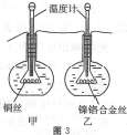 在探究電流通過導(dǎo)體產(chǎn)生的熱量與哪些因素有關(guān)的實驗中,鎳鉻合金絲和銅絲按圖3 所