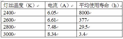 燈具研究所為了研究白熾燈絲的溫度對白熾燈平均壽命的影響,做了如下實驗:保持燈絲內惰性氣體的壓強為0.1atm,鎢絲粗細為250μm,通過改變鎢絲中電流的大小來改變燈絲的溫度,測得燈泡的平均使用壽命與燈絲溫度及電流間的關系如下表所示:分析表中實驗數據可以預測:在與上述實驗相同的條件下,鎢絲溫度在2200K時,其平均使用壽命應最接近于________h,你作出這樣的預測的理由是_____.