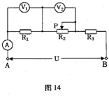 在圖14所示的電路中,A、B兩點(diǎn)之間電壓U保持不變,電路連接完好且使用的電表均為理想電表。當(dāng)滑動(dòng)變阻器的滑片P向右滑動(dòng)時(shí) ( )