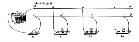 小明同學(xué)所在的學(xué)習(xí)小組,在實(shí)驗(yàn)室里做“模擬遠(yuǎn)距離輸電”實(shí)驗(yàn),裝置如圖所示,MN、PQ為兩根鎳銅合金絲(其電阻不能忽略),在aa′、bb′、cc′之間分別接上相同的3個(gè)燈泡L1、L2、L3,MP之間接電源.則K閉合后( )