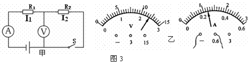 如圖3甲,電源電壓3V,電壓表和電流表的示數(shù)如圖3乙,則流過R1、R2的電流I1=______A,I2=______A,R1上的電壓為_________V,此時R1的電阻為_______Ω。若將電源改為1節(jié)干電池,則R1的電阻為_______Ω。
