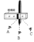 如圖,把一塊厚玻璃磚放在鋼筆前面,筆桿好像錯(cuò)位了, 這種現(xiàn)象是 引起的,此時(shí)觀察者大致在玻璃磚的 (A/B/C)。