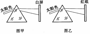 如圖甲所示,讓一束太陽(yáng)光通過(guò)棱鏡射到白屏上,在光屏上就 形成一條彩色光帶,紫外線大致在白屏的(上/下) 。如圖2所示,若在白屏上貼一張紅紙,則光屏上就出現(xiàn) 色。