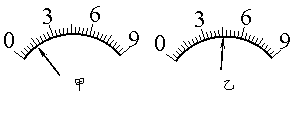某電流表有兩個(gè)量程,只知道大量程是0-9A,小量程刻度值未標(biāo)明,小明為了探究電流表的小量程是多少,他先用大量程測(cè)一較小的電流,其示數(shù)如圖甲,再改用小量程測(cè)同一電流,指針指在圖乙的位置。甲圖測(cè)得的電流值是 A;這電流表小量程每小格表示 。