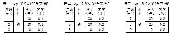 (1)分析表一(或表二、或表三)中的數(shù)據(jù)及觀察到的現(xiàn)象,初步表明:實(shí)心圓柱體對(duì)水平地面壓力的作用效果與_____________的大小無(wú)關(guān)。(2)分析比較實(shí)驗(yàn)序號(hào)1與7(或2與8、或3與9)的數(shù)據(jù)及觀察到的現(xiàn)象,可得出的初步結(jié)論是:_________________________。(3)分析比較實(shí)驗(yàn)序號(hào)__________________的數(shù)據(jù)及觀察到的現(xiàn)象,可得出的初步結(jié)論是:當(dāng)圓柱體的高度相同時(shí),材料的密度越大,壓力的作用效果越顯著。(4)進(jìn)一步綜合分析比較表一、表二、表三中的數(shù)據(jù)及觀察到的現(xiàn)象,還可歸納得出結(jié)論:(a)分析比較表一(或表二、或表三)中的數(shù)據(jù)及觀察到的現(xiàn)象,表明: (b)分析比較表一、表二、表三中的數(shù)據(jù)及觀察到的現(xiàn)象,表明:____________________