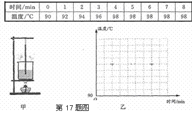 (3)下表是實(shí)驗(yàn)中他記錄的一組數(shù)據(jù),由數(shù)據(jù)可知,水的沸點(diǎn)是 ℃,根據(jù)記錄的數(shù)據(jù),在圖乙中畫出水沸騰前后溫度隨時(shí)間變化的圖像;