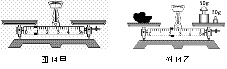 小迪學(xué)習(xí)了“密度”知識后,想測出碳酸鈣樣品的密度,于是他進行了如下實驗:①先將天平放在水平桌面上,如圖14甲所示,他接下來的做法是先 ,再調(diào)節(jié)平衡螺母,使指針指在分度盤中線處;