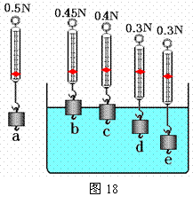 實驗桌上有如下器材:量程符合實驗要求的彈簧測力計一個,一個大水槽里盛有足夠深的水,體積相同的若干鉤碼.該組同學(xué)所做的實驗過程如圖18所示.