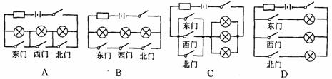 小施學校的教學樓有東、南、西、北四扇大門,放學后要求都要將門關上。平時傳達室的蔣師傅住在南門,每天都要跑三個地方檢查門是否關上,非常辛苦。小施學了電學后為減輕蔣師傅的工作量,設計了一電路圖,即三個門中只要有門沒關好(相當于一個開關斷開),則代表該扇門的指示燈就會發(fā)光。下列電路圖中符合要求的是: