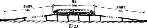圖23是某城市的地鐵設(shè)計方案,進(jìn)站和出站的軌道都與站臺構(gòu)成一個緩坡。為了充分利用能量,上坡前就關(guān)閉發(fā)動機,利用慣性沖上緩坡。已知火車進(jìn)站、停站、出站的時間分別為30s、60s、30s,火車的功率為4800KW(并保持不變),火車車身長300m。